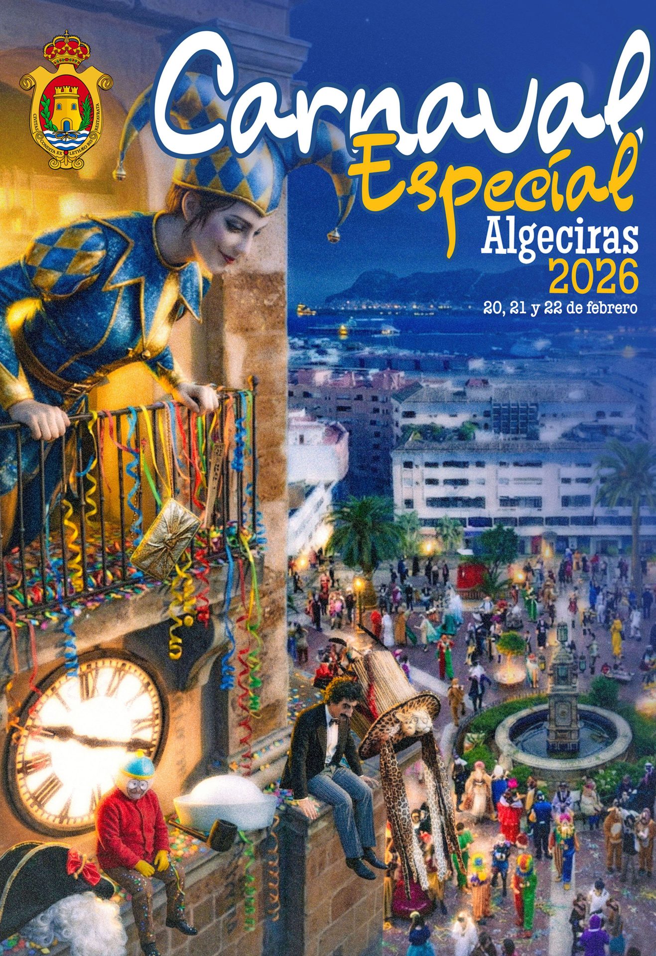 El cartel oficial del Carnaval Especial de Algeciras 2026,¨¡No te escapes! El Carnaval Especial te atrapa¨, obra del artista Miguel Bautista Lima. Siendo el pregonero Fran Amado y el Dios Momo José Antonio Aragón